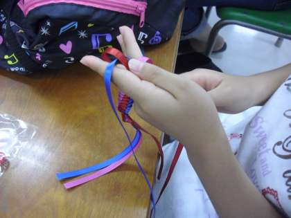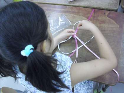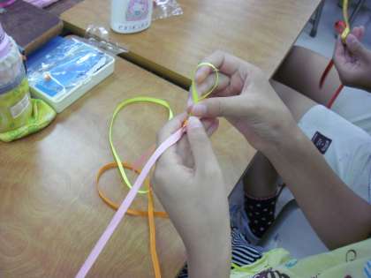 ていねいにリボンを編みこんでいきます。一度覚えると調子よく作業を進めることができます。少しずつ少しずつ編んだ部分が長くなってきました。