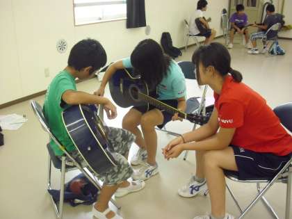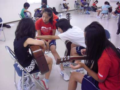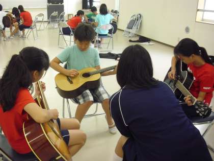 課題曲は「かえるのうた」です。5つのグループに分かれて中学生が小学生に弦のおさえ方やギターの弾き方を教えています。中学生は小学生の名前を呼びながら、やさしく教えてくれます。