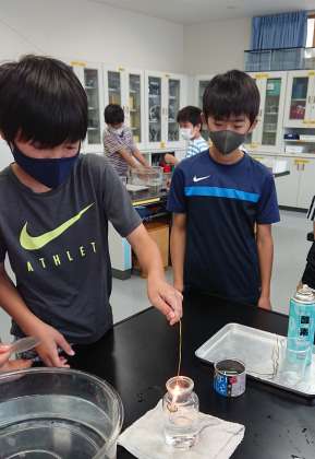 窒素、二酸化炭素、酸素の中でろうそくはもえるだろうかという実験をしました。酸素の中では、明るく輝いて燃えました。窒素、二酸化炭素の中ではすぐに消えました。