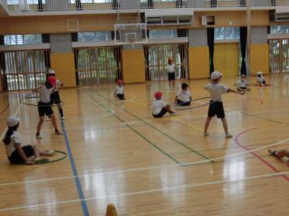フラフープを使い、学級の中でだれが一番長く回せるかを競っていました。フラフープが早く落ちてしまった子供もいましたが、学級の友達を「がんばれ!」と一生懸命に応援していました。どの子供も体を上手に使い、フラフープを腰で回すことができました。