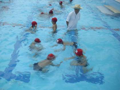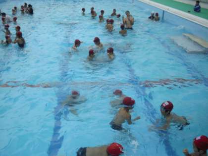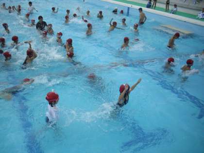 水中ジャンケン遊びです。何度も水の中にもぐってジャンケンをしました。遊びを通して、浮く・泳ぐ運動につながる動きを身に付けていきます。
