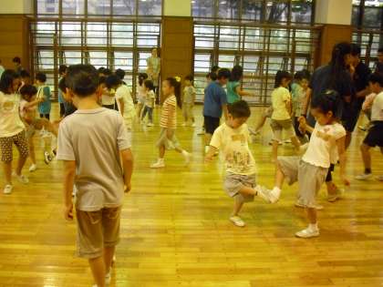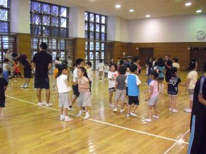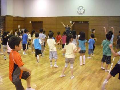 サマーワークショップ「運動能力アップ体操教室」の様子です。体操教室のインストラクターの方を講師に招き、実施しました。まず自由に歩き回って出会った人と手を合わせたり、足の裏を合わせたりしました。