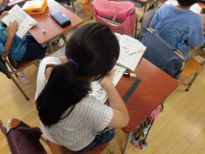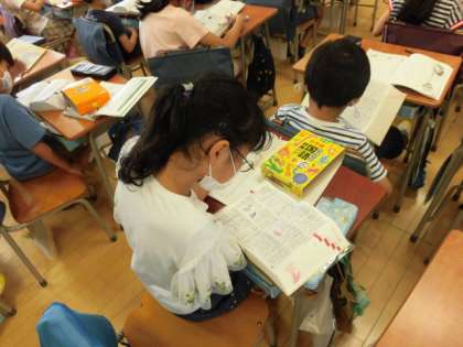国語辞典を使って、同じ音の言葉を調べていました。一生懸命に辞典で調べ、ノートにまとめる姿は、とても立派でした。どんどん辞典を使って、言葉の力を高めてほしいと思います。