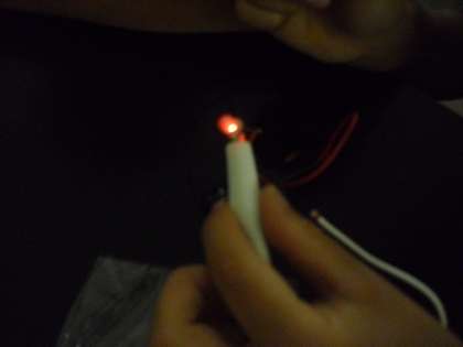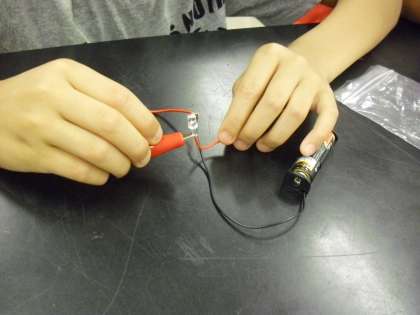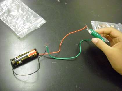 電池ボックスに電池を入れ、クリップをつないでLEDの二本の線に、両極をつなげると・・・光りました。