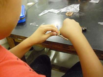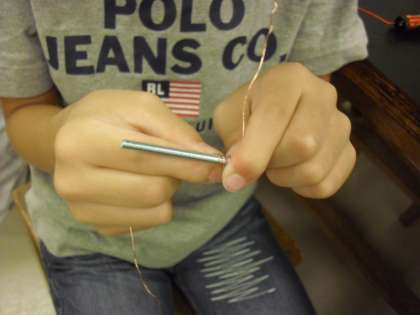 新たな材料で、コイルを作っていきます。ネジ状のものに長い導線を巻いていきます。何度か折り返して、太くなってきました。