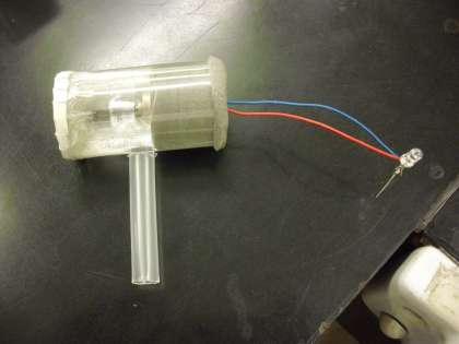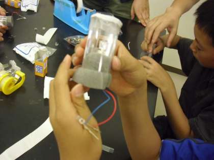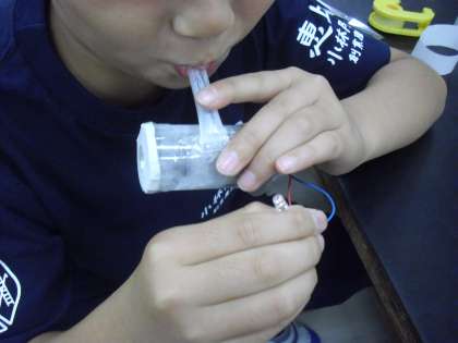 モーターの先に風受け付けてプラスチックケースに入れます。空気の吹込口が風受けに当たるようにします。思い切り息をふきこむとモーターが回り、LEDが発光する仕組みになっています。「ふぅ〜力発電」です。子どもたちはとても喜んでいました。