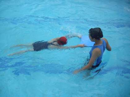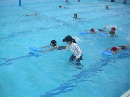 中学年の水泳教室の様子です。課題別に分かれての練習です。個別の課題に対してていねいに指導しています。時々、日差しも差してきます。
