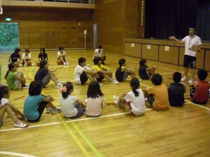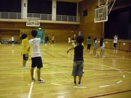 芦花中学校の野口校長によるサマーワークショップ「楽しいバスケットボール教室」の様子です。中学校のバスケットボール部の数人も手伝いに来てくれました。準備運動をして体をほぐします。