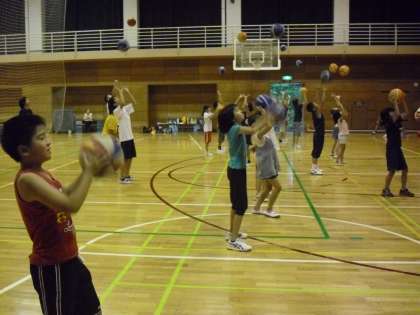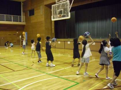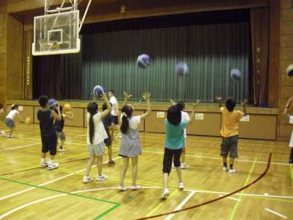 バスケットボールに慣れることから始めました。ボールを真上に投げ上げ、おでこのところで受けます。立つ位置は変えません。同じ場所で投げてキャッチします。