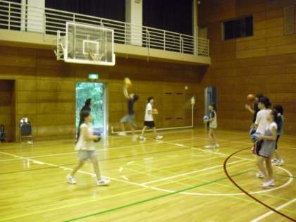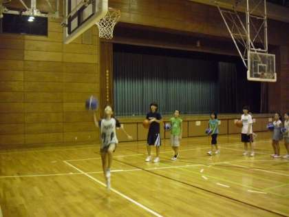 シュート練習の様子です。レイ・アップ・シュートを教えてもらいました。何本か続けて練習していく中で、子どもたちもコツをつかんできたようです。この講座は明日もあります。