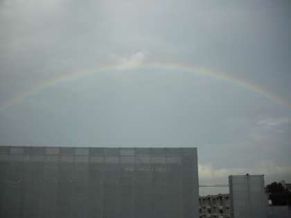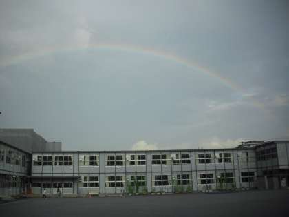 夕立が止んだ空に、虹がかかりました。上の写真は3階の図工室の窓から写したものです。下の写真は校庭から写したものです。学童から帰る子どもたちも「きれい」と喜んでいました。