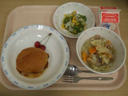 無塩パン(東京)、豚肉(鹿児島)、冷凍鶏ガラ(神奈川)、ホキ(ニュージーランド)、バター(北海道)、スライスチーズ(兵庫)、ひよこ豆(アメリカ)、マカロニ(イタリア)、マッシュルーム水煮(岡山)、ホールコーン(北海道)、アスパラガス・さくらんぼ(山形)、にんにく・りんご(青森)、しょうが(高知)、たまねぎ(愛知)、にんじん・パセリ・大根(千葉)、キャベツ(茨城)、きゅうり(群馬)