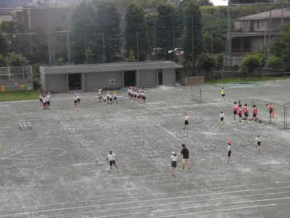 担任の先生から、インターバルをリズムよく走ることや、前傾姿勢を意識することを指導された後、練習をしました。