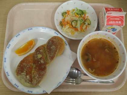 ミルクパン(東京)、豚肉(北海道)、冷凍鶏ガラ(神奈川)、ベーコン(日本・デンマーク)、うぐいすきな粉(北海道)、ひよこ豆(アメリカ)、ダイストマト(イタリア)、マッシュルーム水煮(岡山)、ホールコーン(北海道)、バレンシアオレンジ(愛媛)、パセリ・にんじん(千葉)、にんにく・りんご(青森)、たまねぎ(愛知)、セロリー(長野)、じゃがいも(長崎)、キャベツ(茨城)、きゅうり(群馬)