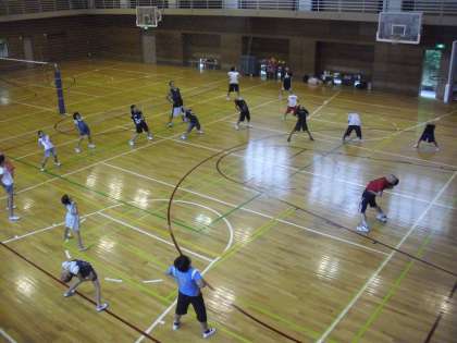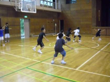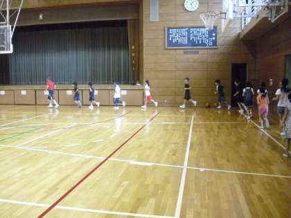 第2回目のサマーワークショップ「楽しいバスケットボール教室」の様子です。ランニング、準備運動、フットワークの練習をしているところです。2回目なので、子どもたちの動きもスムーズです。