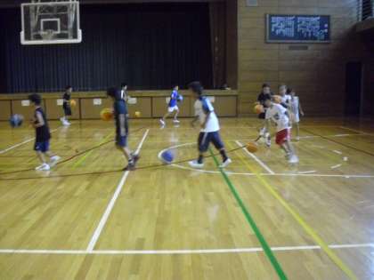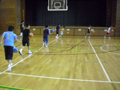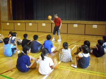 芦花中学校の野口校長の熱い指導の様子です。ボール操作のコツを子どもたちに伝えていました。その後、ドリブルで体育館の中を走り回りました。