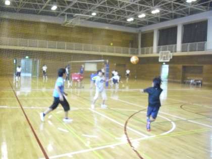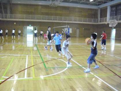 2対1でオフェンスとディフェンスに分かれ、パスからシュートにつなげる練習をしました。中学生に励まされながら、だんだんとプレーの形になってきました。