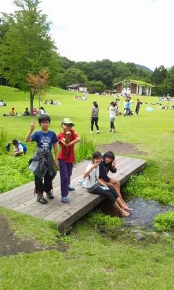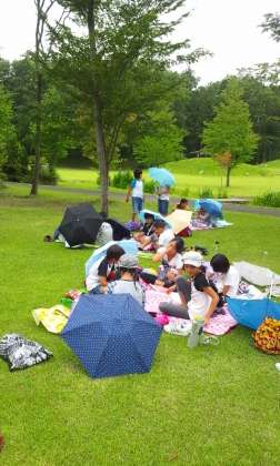 お弁当を食べていると少し雨が。 傘をさして食べているとグループもあります。でも、しばらくするとまた晴れ間が見えてきました。川に足を入れて気持ちよさそうにしている人たちもいます。