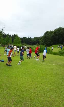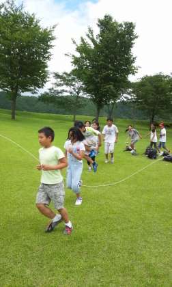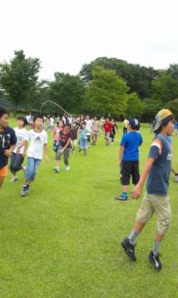 遊びの後は全員で大縄です。広い場所があり、下は芝生で涼しい風がふき、みんなやる気満々です。