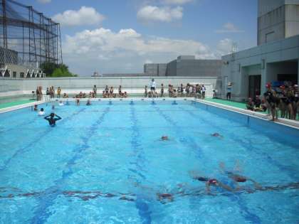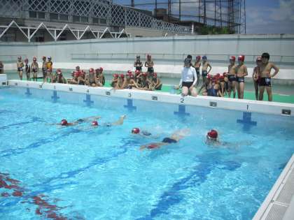 中学年の水泳教室の様子です。今日は、晴れたり、曇ったり、雨が降ったりと変わりやすい天候ですが、この時間は日差しが差しています。検定を受ける友達に声援を送る姿も見受けられました。