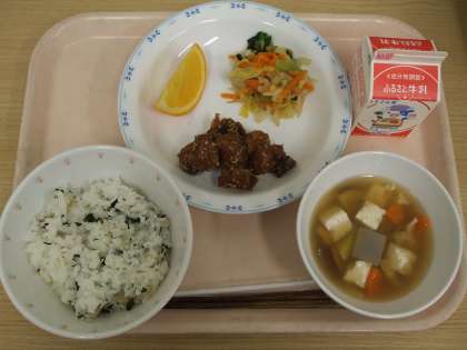 米(茨城)、かつお(日本近海)、豆腐(東京)、油揚げ(神奈川)、板こんにゃく(群馬)、炊き込みわかめ・じゃこ(広島)、白ごま(スーダン・パラグアイ)、ごぼう(群馬)、にんじん・さつまいも(千葉)、大根(青森)、ねぎ・小松菜(茨城)、白菜(長野)、もやし(栃木)、甘夏みかん(熊本)