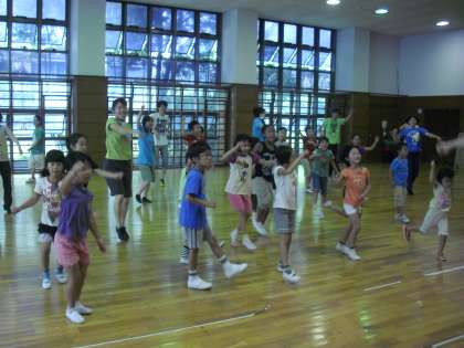 子どもたちもノリノリです。同じ動きのくり返しなので、覚えやすいのがいいところです。子どもたちも自信をもって体を動かしています。