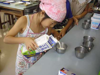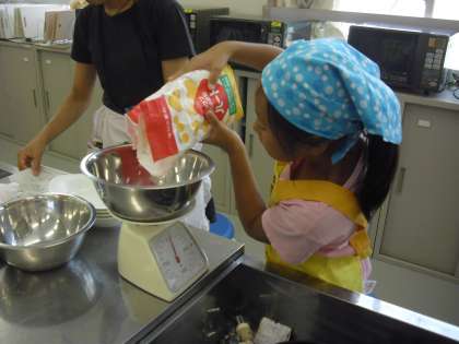 生地づくりの様子です。計量器を使って300gの粉を入れます。数字を見ながら少しずつ足していきます。その中に、牛乳やヨーグルト、オリーブオイル等を入れていきます。