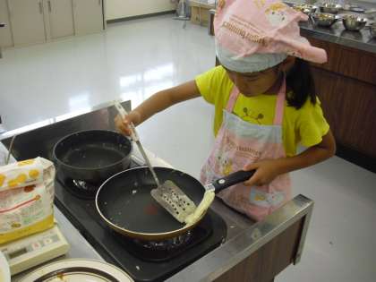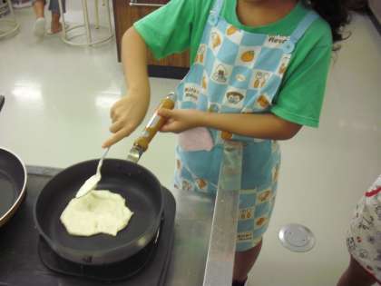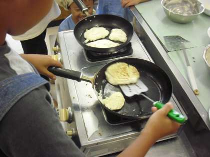 フライパンで生地を焼きます。生地をスプーンで入れ、平らにのばしていきます。フライ返しで生地を返しながら、ほどよく焼き目がつくくらいまで焼きます。