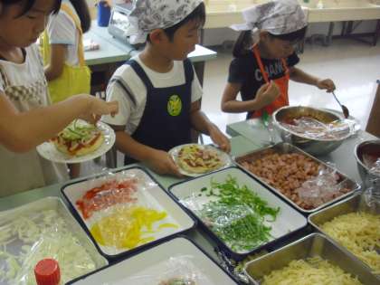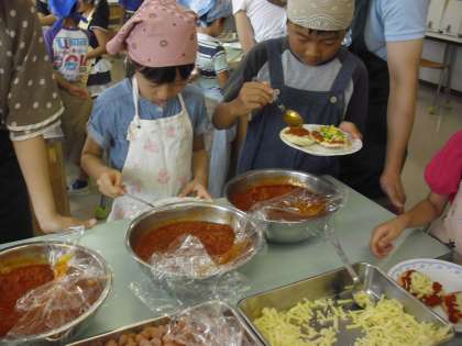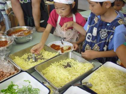 焼き上がった生地にトッピングしていきます。まず、トマトソースをぬります。その次に、好きな具材をトッピングして、最後はチーズです。