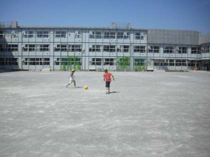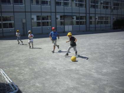 学童の子どもたちの様子です。花だんのひまわりが大きく大きくのびています。校庭でサッカーをして遊ぶ子どもたち。元気です。