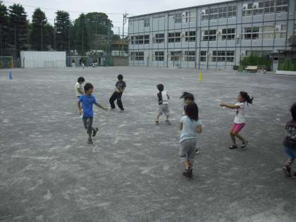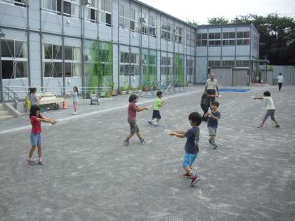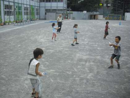 BOPの子どもたちが、ペットボトルで作った水でっぽうで遊んでいる様子です。水をかけあって、走り回っています。気持ちよさそうに楽しく遊んでいます。