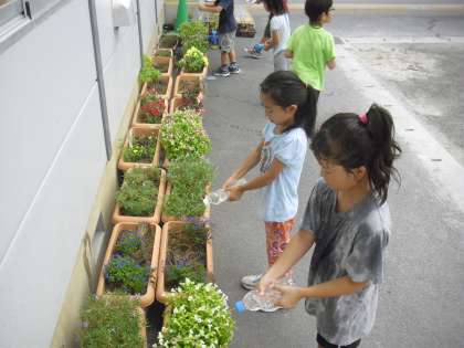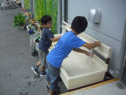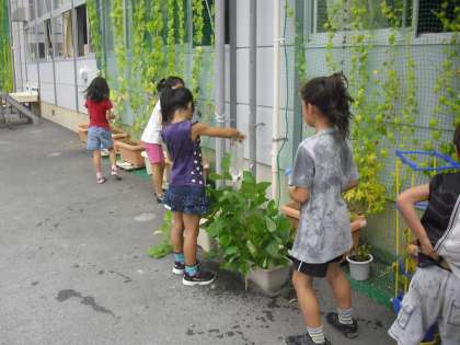 遊びおわった後は、水でっぽうを使って校庭の植物にお水をあげてくれました。