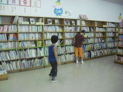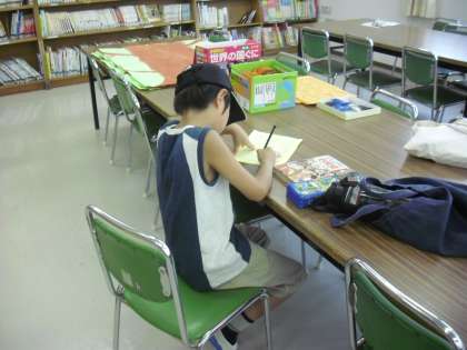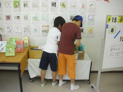 読み終わった本を返却し、新しい本を借りている様子です。自分のカードに新しく借りる本の題名を記入しています。次回の貸し出し日は22日(月)です。