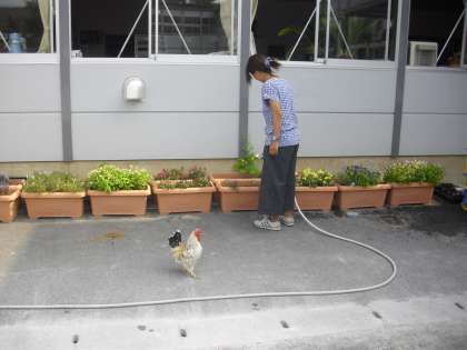 今朝の様子です。日直の先生が、校庭の植物に水をあげているところです。近くにはニワトリがいます。朝ごはんを待っているようです。