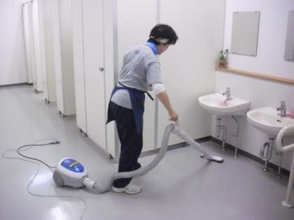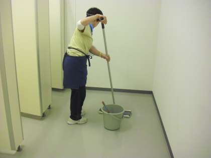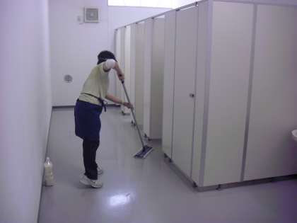 主事さんがトイレのワックス掛けをしているところです。きれいに埃を吸い取ってから丁寧にワックスを塗っていきます。トイレは男女別だと12箇所あるので、計画的に行っています。