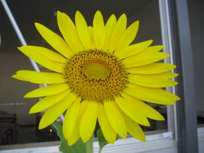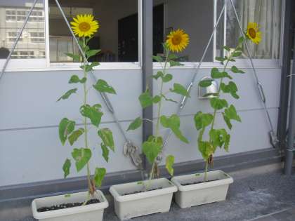 校庭で育てている植物の様子です。これは3年生が育てているヒマワリです。今は朝ですが、花がお日さまに向かって伸びています。