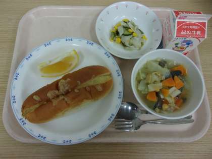 無塩パン(東京)、鶏肉(北海道)、冷凍鶏ガラ(神奈川)、ハム(埼玉・群馬・茨城)、ベーコン(日本・デンマーク)、バター・シュレッドチーズ(北海道)、ひよこ豆(アメリカ)、マッシュルーム水煮(山形)、白いんげん豆・ホールコーン(北海道)、河内晩柑(熊本)、たまねぎ(愛知)、じゃがいも(茨城)、パセリ・にんじん(千葉)、キャベツ・きゅうり(群馬)、セロリー・レタス(長野)、大根・りんご(青森)