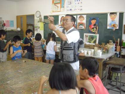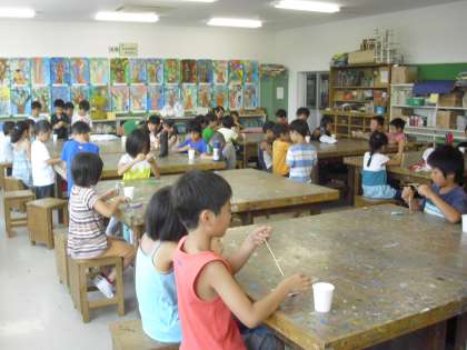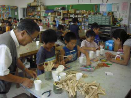 サマーワークショップ「竹とんぼづくり(低学年)」の様子です。図工室がいっぱいになるほど子どもたちが参加しました。材料を全員に配り、講師の先生が作り方の説明をしているところです。