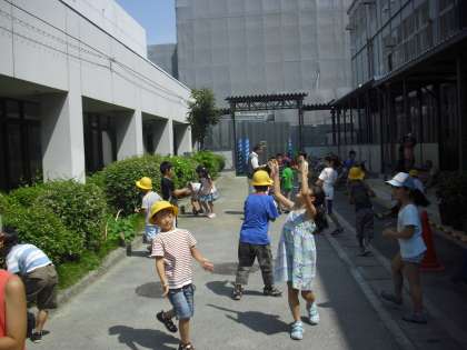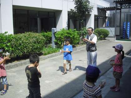 完成した竹とんぼを持って外に出ました。校庭は中学校の野球部が使っていたので、体育館と仮設校舎の間で飛ばしてみました。飛んだ自分の竹とんぼをうれしそうに追いかけていました。