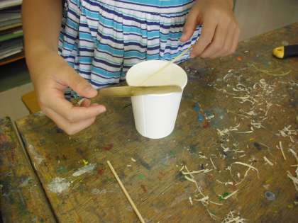 削るのは4カ所です。やはり左右のバランスが均等になるように、削ってみては紙コップの上に置いてバランスを確認しながら削っていきます。
