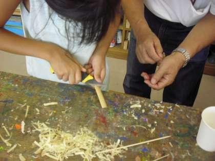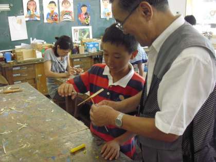 講師の先生にアドバイスをもらいながら、全員、自分で削った竹とんぼを完成することができました。後片付けをして校庭に向かいます。