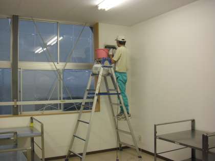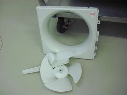 配膳室の換気扇の清掃をしているところです。取り外した部品はスポンジできれいに洗い、再び取り付けます。