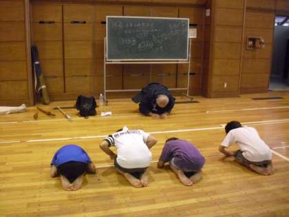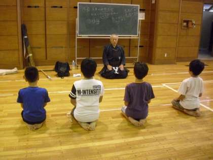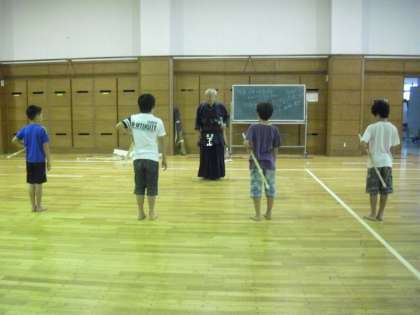 サマーワークショップ「剣道教室」の様子です。「よろしくお願いします」と講師の先生とあいさつをしているところです。礼も武道の大切な所作の一つです。