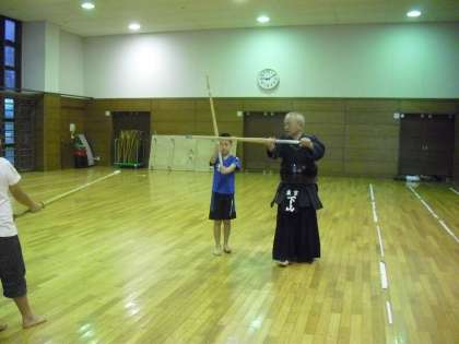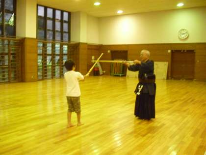 今度は講師の先生の竹刀に面打ちを行っているところです。子どもたちも「めん!」と声を出しながら打ちこみます。