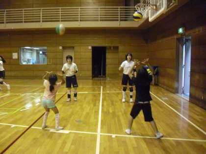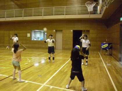 初心者には、中学生が本当にやさしく丁寧に教えてくれています。ボールもソフトバレーボールを使ってみるなど工夫してくれました。