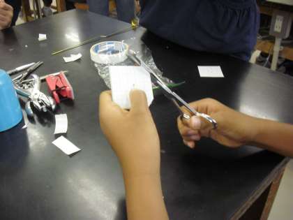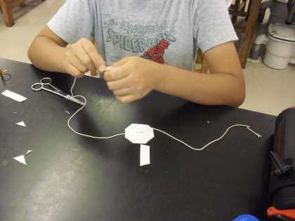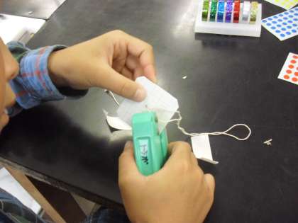 中学校第2理科室で行った科学講座「くるくるレインボー」の様子です。正方形の板目紙に穴を開けてたこ糸を通します。