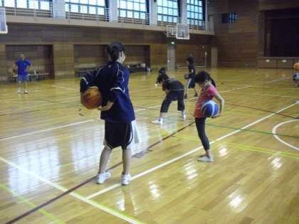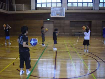 ボール操作の練習です。ボールを頭、腰、足の回りを回します。困っている子には中学生が積極的に教えてくれます。