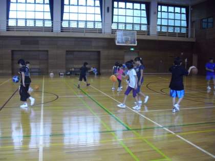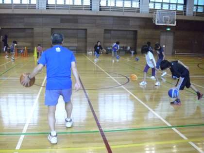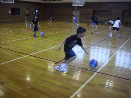 ドリブルの練習です。強いドリブル、速いドリブル、動きながらのドリブル等、様々なドリブルを行います。