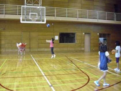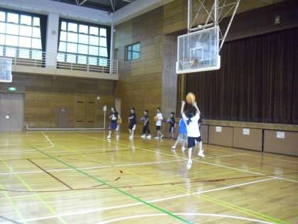 シュート練習の様子です。2つに分かれて行いました。リングを直接狙うのではなく、バックボードを活用しながらシュートをする練習です。