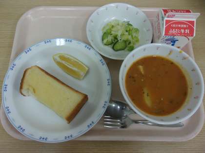ミルク食パン(東京)、豚肉(北海道)、冷凍鶏ガラ(神奈川)、バター(宮崎・北海道)、ひよこ豆(アメリカ)、マッシュルーム水煮(岡山)、冷凍枝豆(北海道)、河内晩柑(愛媛)、レモン(高知)、たまねぎ(愛知)、にんじん(千葉)、トマト(岩手)、じゃがいも(茨城)、パセリ(茨城・長野)、きゅうり(秋田)、キャベツ(群馬)